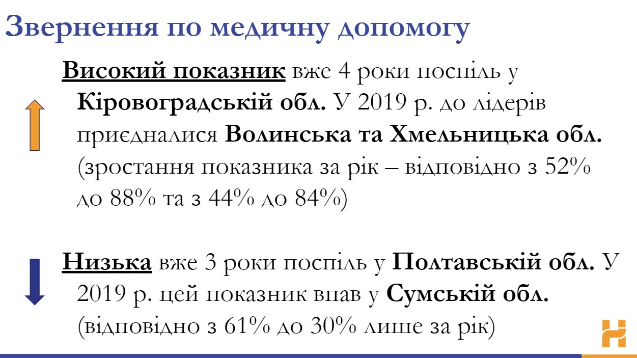 В цілому по Україні лише 52% громадян задоволені медичною допомогою в стаціонарі (2018 – 56%, 2017 – 57%, 2016 – 58%). Високим уже три роки поспіль цей показник є у Волинській обл. У 2019 році до лідерів приєдналися Хмельницька і Донецька обл. (зростання показника в них за рік – відповідно з 29% до 69% і з 41% до 69%). Низьким вже три роки поспіль цей показник є в Запорізькій, Кіровоградській обл., а лише за рік він значно впав у Харківській обл. (з 78% до 23%) та Києві (з 56% до 37%).